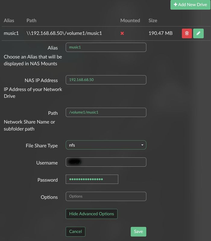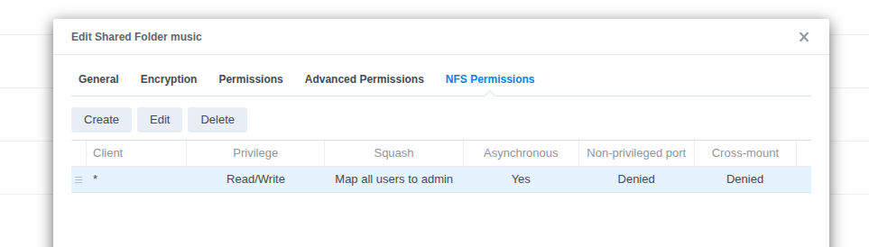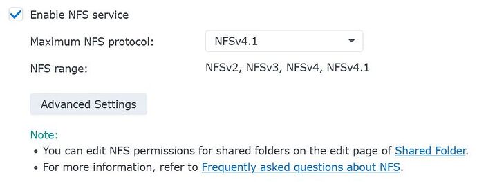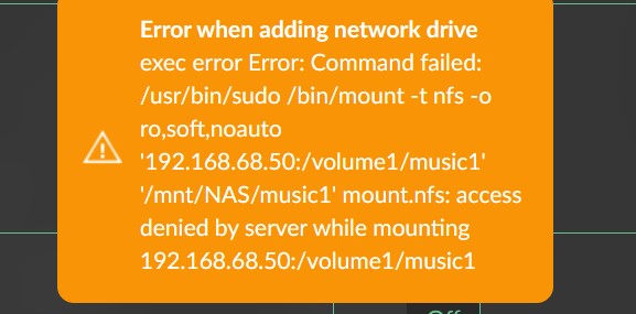 @sngreen Don’t forget to set NFS permissions on the NAS shared folder, I set squash to “map all users to admin”. And give read permission to admin. Also set ip of the client (volumio) or use “*”