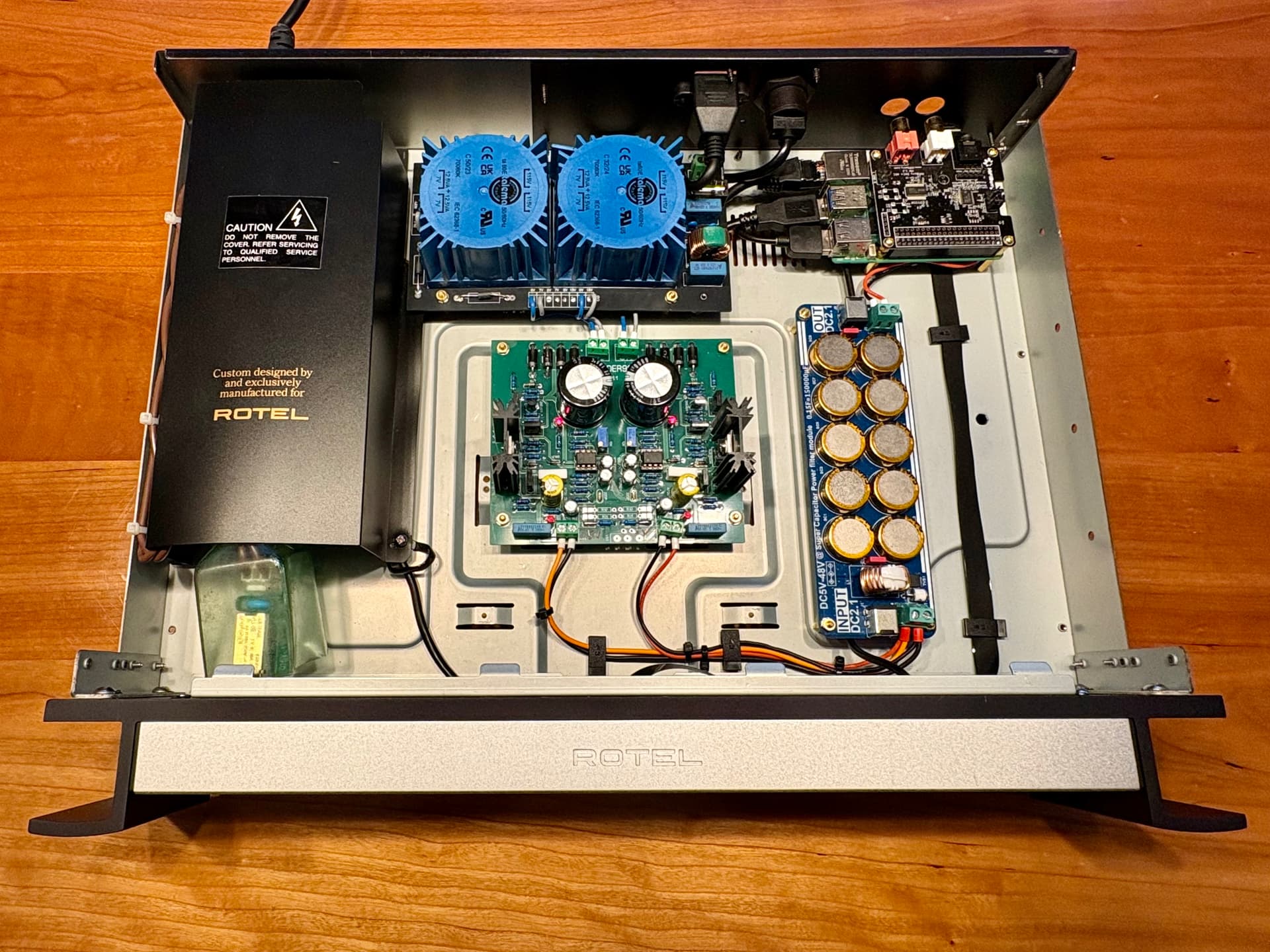 Double Talema 2x7V high end toroidal audio transformers feed a double Studer 900 Ultra low noise lineair power supply. Over a 5V-10A super capacitor filter board the Rpi5 and Hifiberry DAC+ are powered.