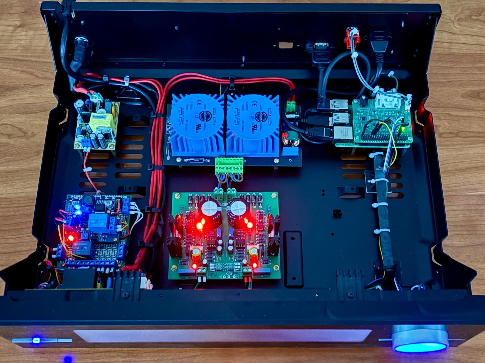 The base was found in an old defective HK amplifier. We stripped the case from all electronics and removed the front panel. A new front panel was designed and cut with a laser cutter. A 11.9" Waveshare touchscreen is used on a Rpi 4B, 2 Gb with an IQ audio DAC Pro. A separate 15W power supply for the touchscreen was combined with an ultra low noise PS on dual Talema toroid transformers. The encoder knob is for selecting prev/next track when turned or play/pause when pushed. The power button on the left powers the unit on and off. In off state, it is in standby mode and uses very little power.