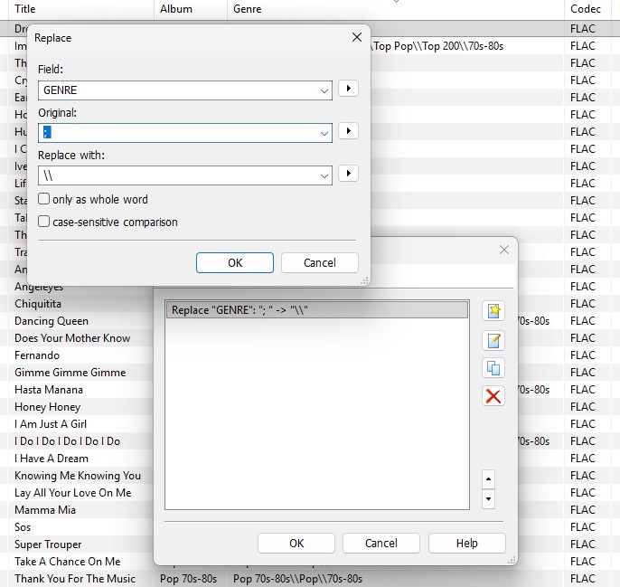 - In Windows, on Mp3tag, I replace the semicolons in the genres (which work great in the MusicBee player) with two backslashes without spaces using an action. The photo is attached.