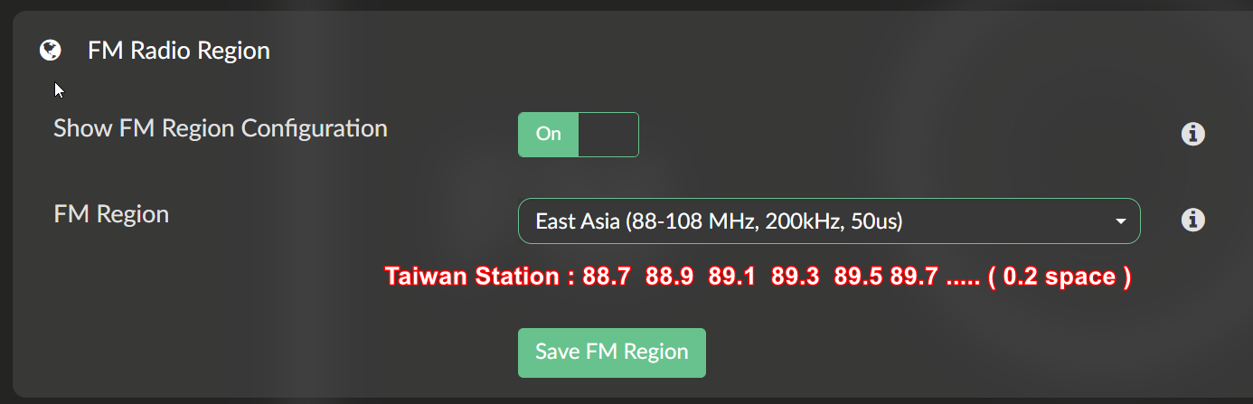 East Asia: 88-108 MHz, 200kHz spacing, 50us de-emphasis
