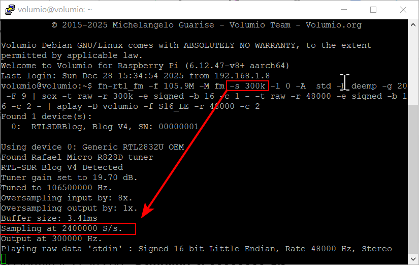 fn-rtl_fm -f 100.0M -M fm -s 171k -l 0 -A std -g 20 -F 9 -E deemp | sox -t raw -r 171k -e signed -b 16 -c 1 - -t raw -r 48000 -e signed -b 16 -c 2 - | aplay -D volumio -f S16_LE -r 48000 -c 2