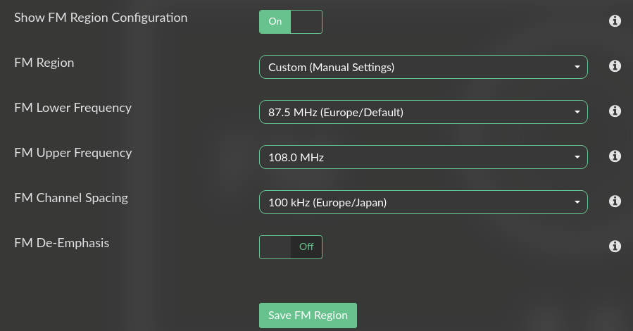After changing region, a page refresh (F5) is required to update visible fields. This is a Volumio framework limitation.