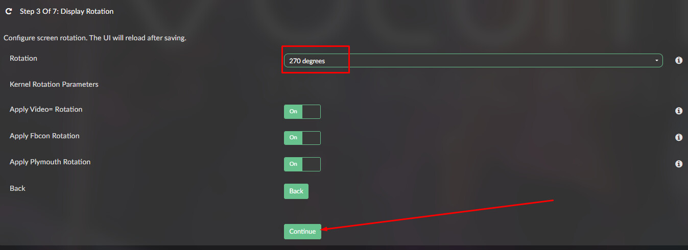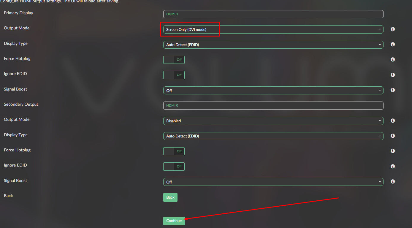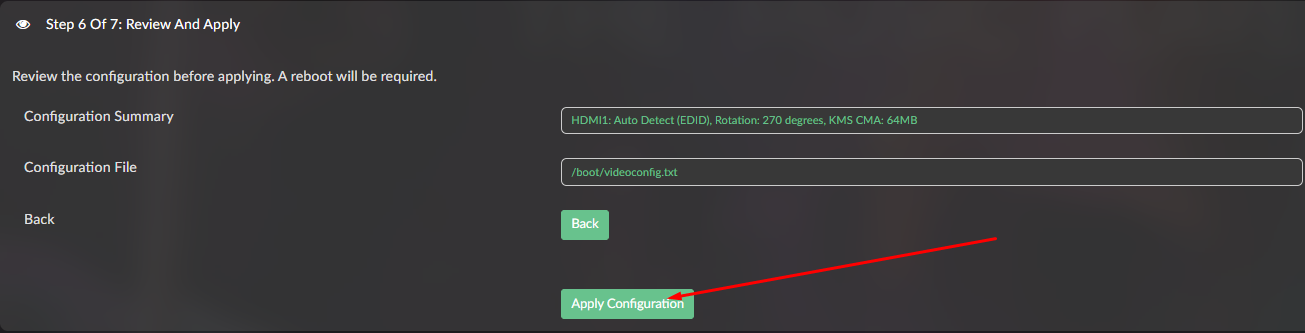 - Step through: Output Type → Display Preset → Rotation → KMS Settings → Advanced → Review → Apply