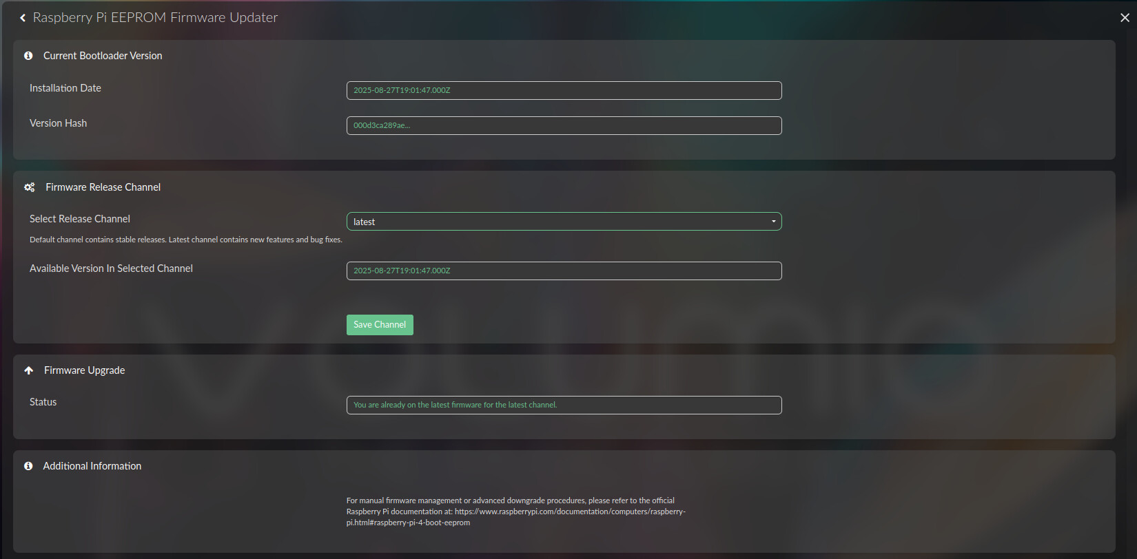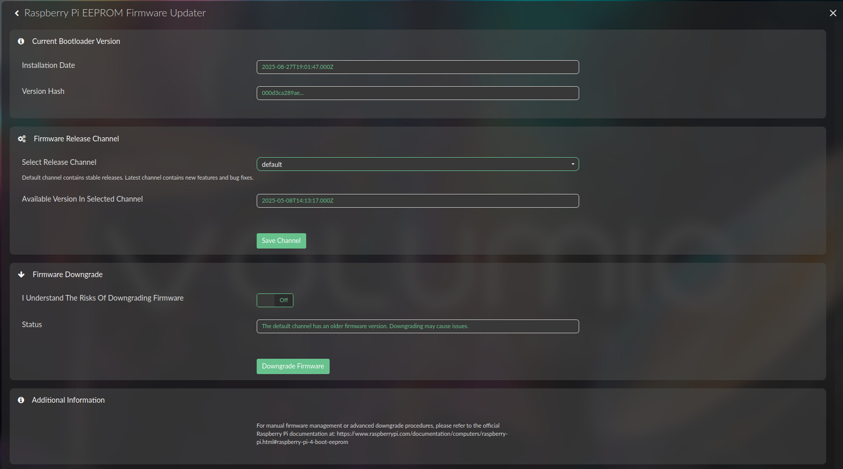 This plugin allows you to update or downgrade your Raspberry Pi’s bootloader firmware without leaving Volumio. The bootloader is stored in EEPROM (non-volatile memory) and controls the initial boot process before the operating system loads.