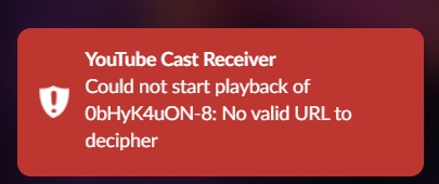 My YouTube smartphone apk is properly connected via the Volumio Cast receiver plugin code for the TV, but when I play a file on YouTube on my smartphone, the streaming doesnāt start and then I get this error message on Volumio.