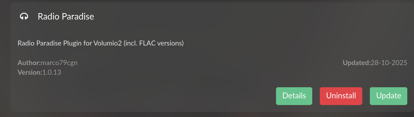 Thank you for your feedback. The problem I am describing happens with the plugin. I tried several times to uninstall it and reinstall it but the problem remains. Oddly the Radio paradise plugin version in the list of plugins in the Volumio app is 1.0.14 but once installed, it mentions the version 1.0.12 (I don’t know how relevant this is…?). What I have noticed is that the information displayed on the Volumio app on the iPhone is always synchronized with the music broadcasted by Radio paradise live (for example through its proprietary app) but very often (more so than not) the music played by the Volumio Rivo + through Radio paradise plugin does not correspond to the display (which is in synch with the live broadcast of the radio). The lag is in the 5 to 10 minutes range so a few songs. Marco from Volumio told me that the third party plugin is most likely responsible for the problem, not the hardware (Volumio rivo+) or the Volumio app. He advised me to reach out to the community. I also get sometimes an error 404 when the Volumio rivo+ is unable to connect with the Radio paradise http address. I need to mention that when it happens the Volumio rivo+ connects without problem to the streaming platform I use. So it’s not related to a wifi connection issue.