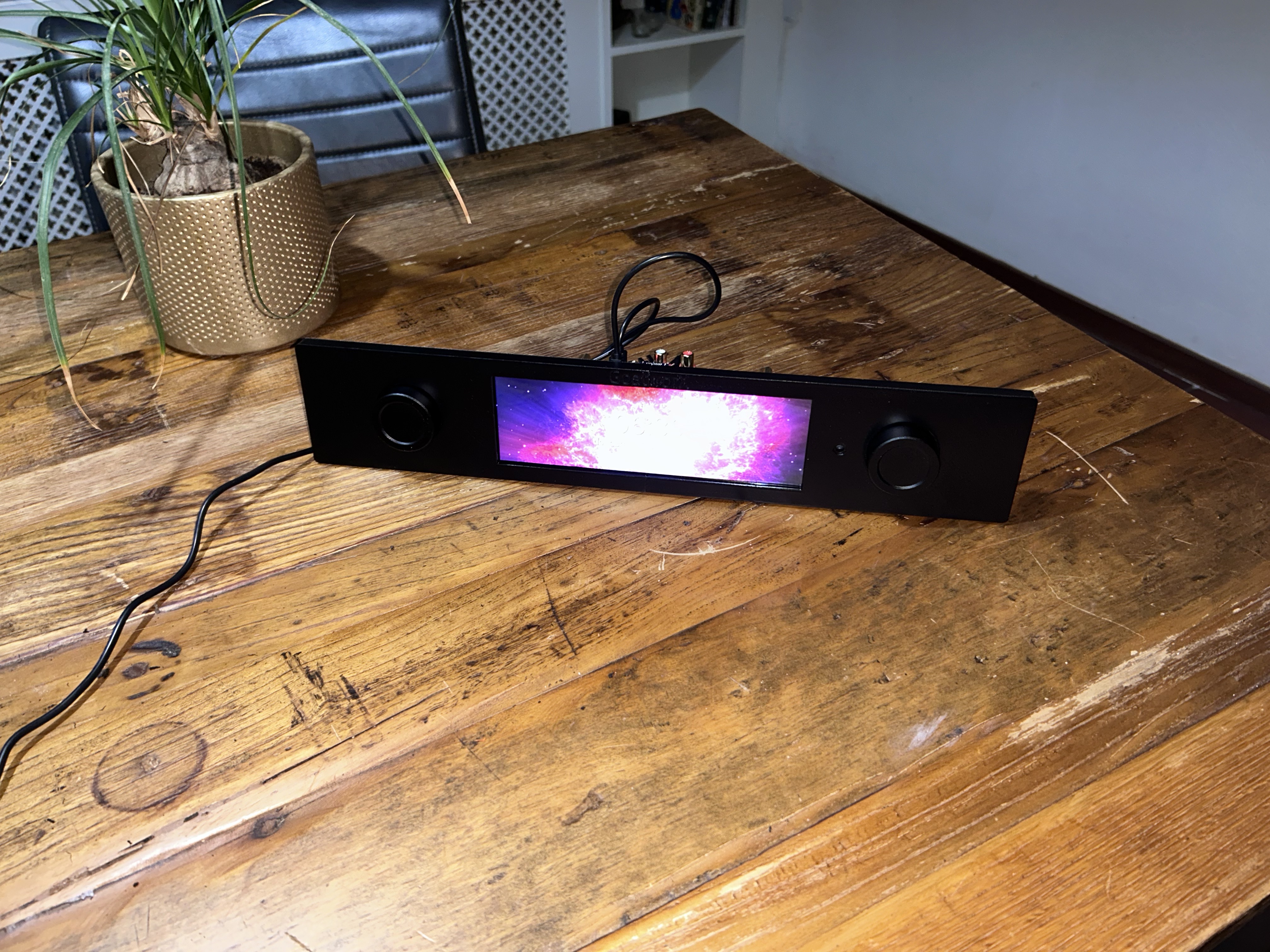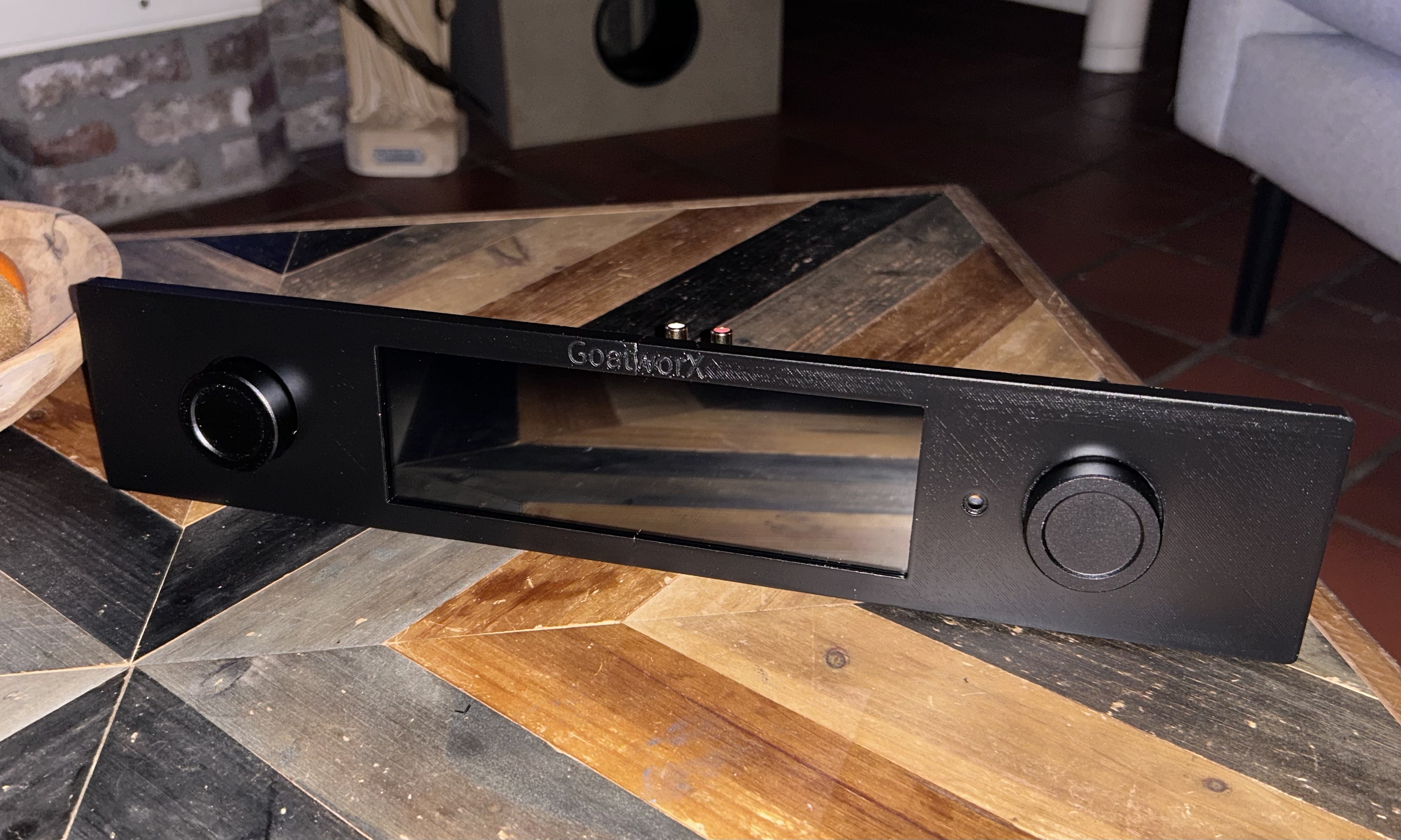 Clean and basic: 2 rotary encoders, a hole for a IR led and the screen in the middle. The buttons lay back in the front about 2mm. The IR led wil be covered by some dark/smokey plexiglas.