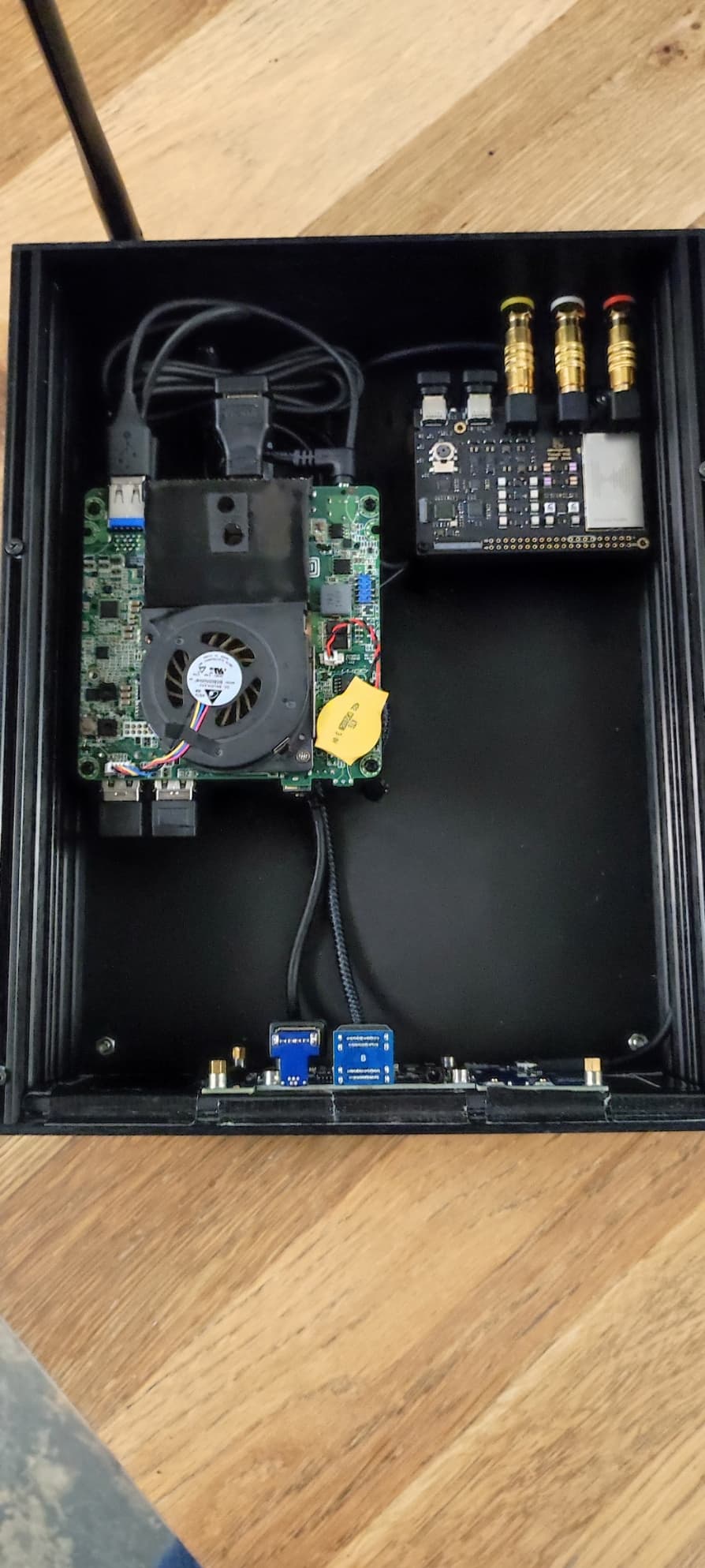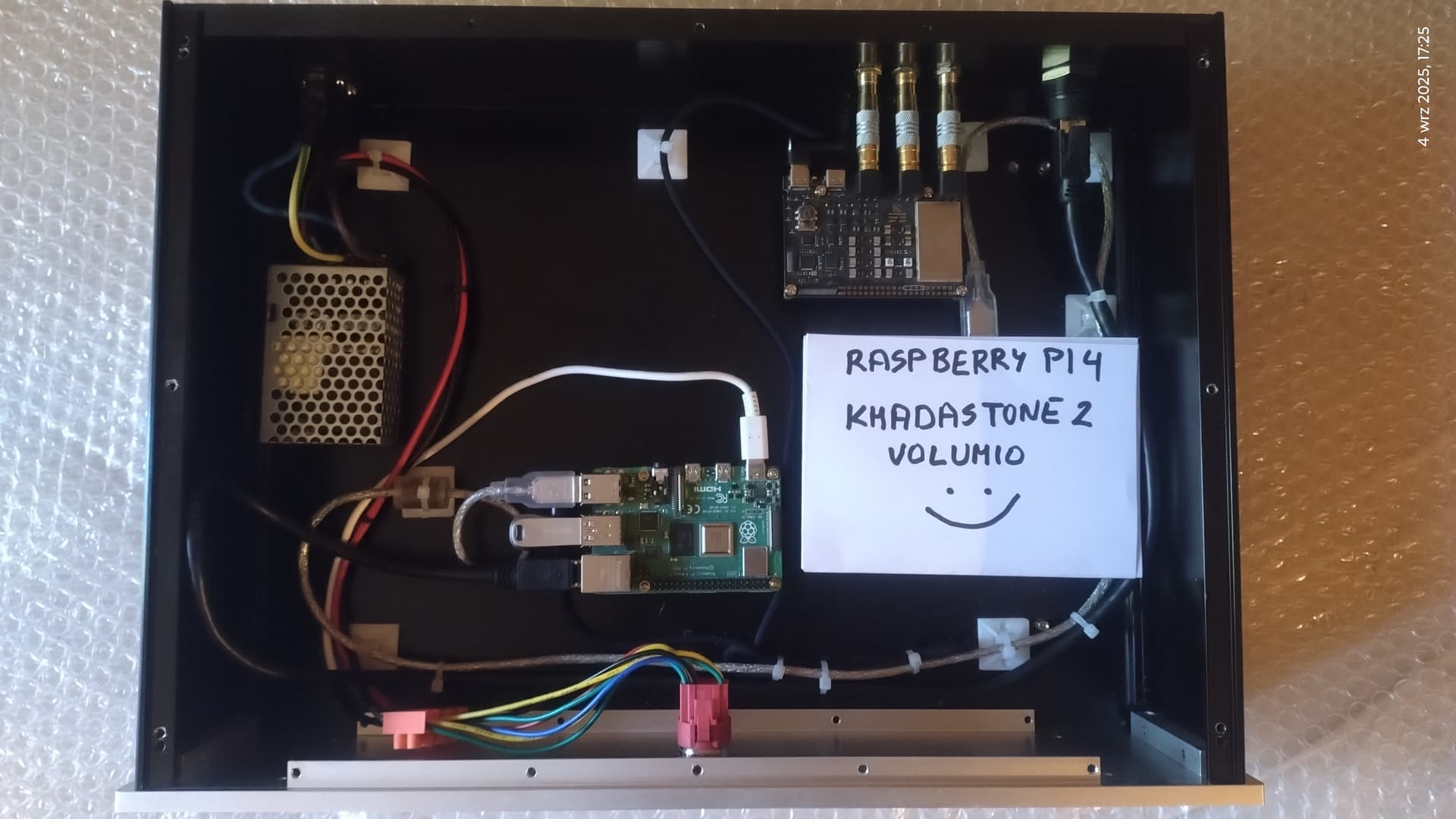 Inside Raspberry Pi 4B / Khadas Tone 2 Maker / USB - SATA adapter with 2.5 cal 1 TB SSD SATA - Mean Well 5V - 5A power supply.