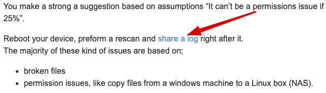 I then scanned the music source but volumio only found about 25% of the music I have on my NAS server. It can’t be a permissions issue if it finds 25%, so why doesn’t find the rest of my music files.